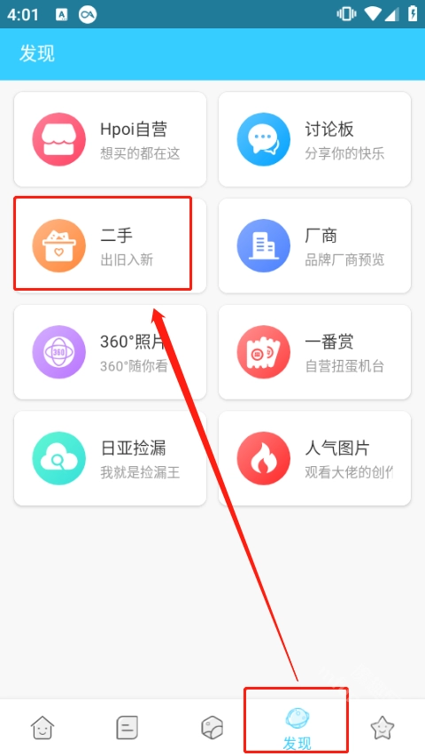 1. 第一步,打开hpoi,接着从底部菜单栏进入发现板块,然后选择二手。