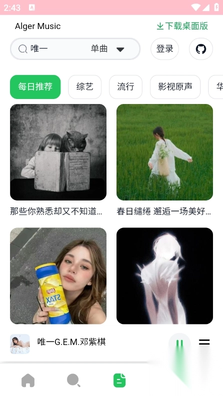 AlgerMusicPlayer,这款由开源社区精心打造的跨平台音乐播放软件,始终致力于为用户带来高质量且便捷的听歌体验。它具备强大的多平台支持能力,无论是网页端、桌面系统,还是移动设备,用户都能轻松接入。无需依赖特定客户端,就能尽情畅听海量丰富的音乐资源。其中,AlgerMusicPlayer手机版运用现代化技术架构进行开发,其界面设计呈现出简洁大方的风格,交互过程十分流畅,各项功能也极为实用。使用algermusicplayer的用户,不仅可以轻松实现搜索、收藏音乐以及创建个性化歌单等操作,还能享受毫干扰、纯净的音乐播放环境。