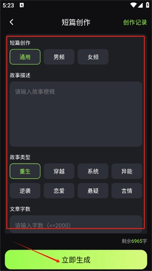 4、点击短篇创作服务进入,输入故事梗概,选择故事类型、字数,点击立即生成即可