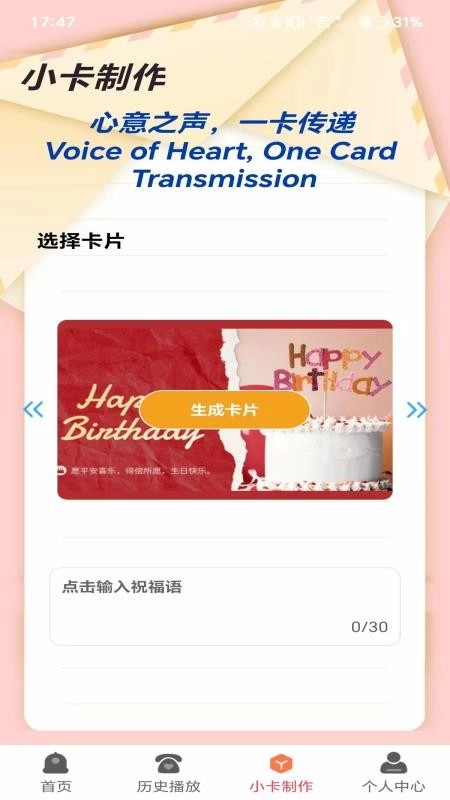 5、在小卡制作页面,就能自行输入内容,并能一键快速生成卡片;