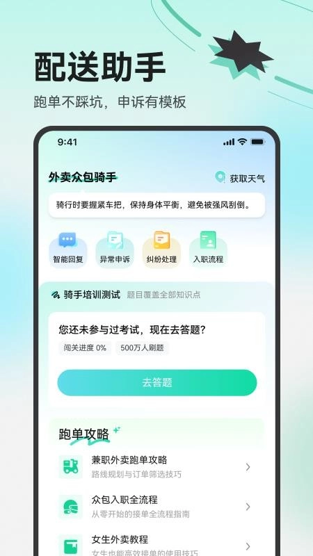 软件为用户提供了专属的配送助手,帮助用户快捷配送,轻松实现骑手的培训测试。