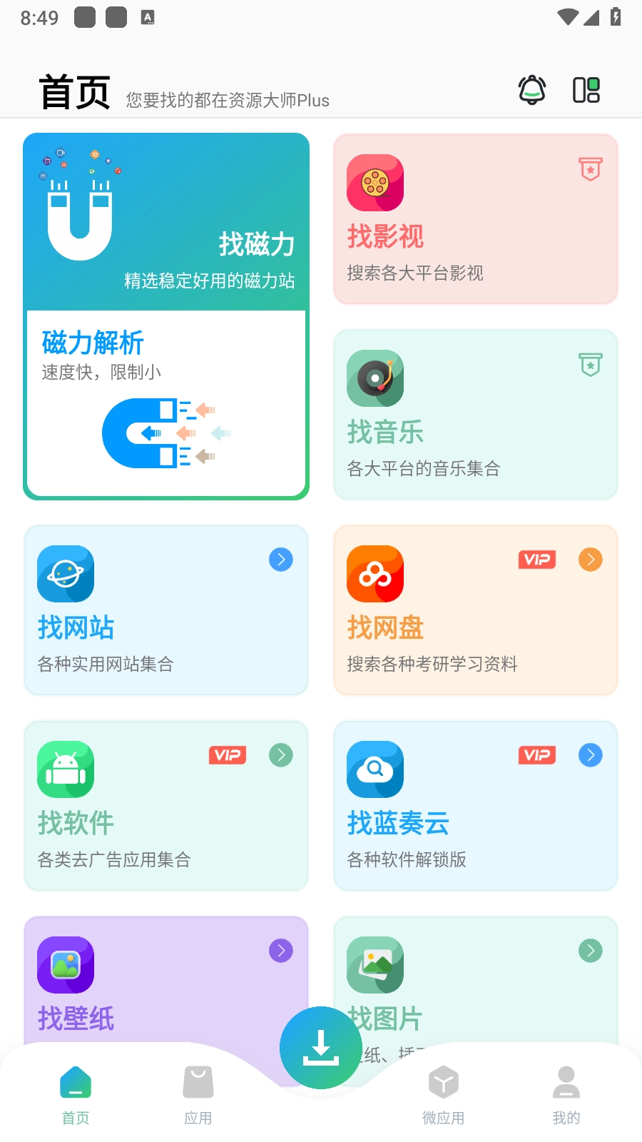 2.登录后返回App首页,可以看到丰富的功能列表,如找磁力、找影视、找网站等