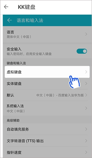 3、除此之外,大家还可以选择去手机的设置页面里找到“语言和输入法”功能,从“虚拟键盘”的功能里设置KK键盘为默认输入法。