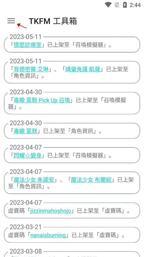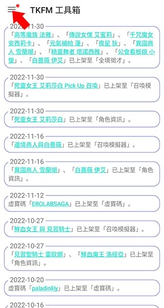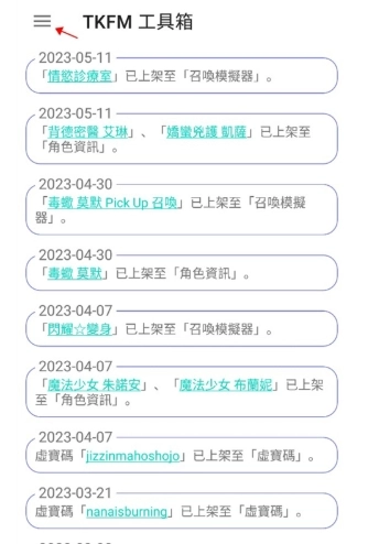 1、接着打开tkfm工具箱的最新版本,进入首页之后,点击左上角的三条横杠按钮。