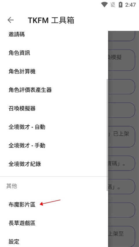 2、打开侧边栏菜单后,往下滑找到并点击布魔影片区