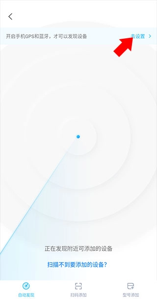 3、此时如果设备在通电开机状态下,且手机离设备距离较近,可自动发现设备,如果此时没有自动查找到设备,那么我们点击下方的扫码添加。