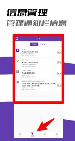 2、在“过滤”页面管理通知信息,可以查看隐藏与显示的消息。