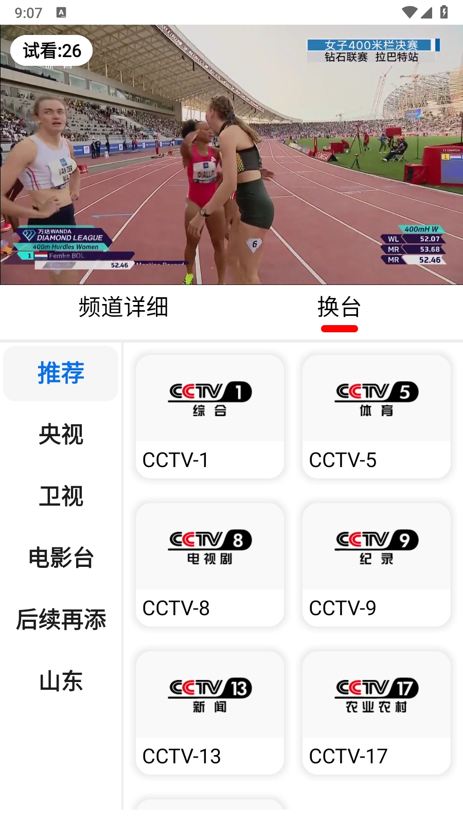 5.点击换台按钮,可以切换到其他电视频道观看