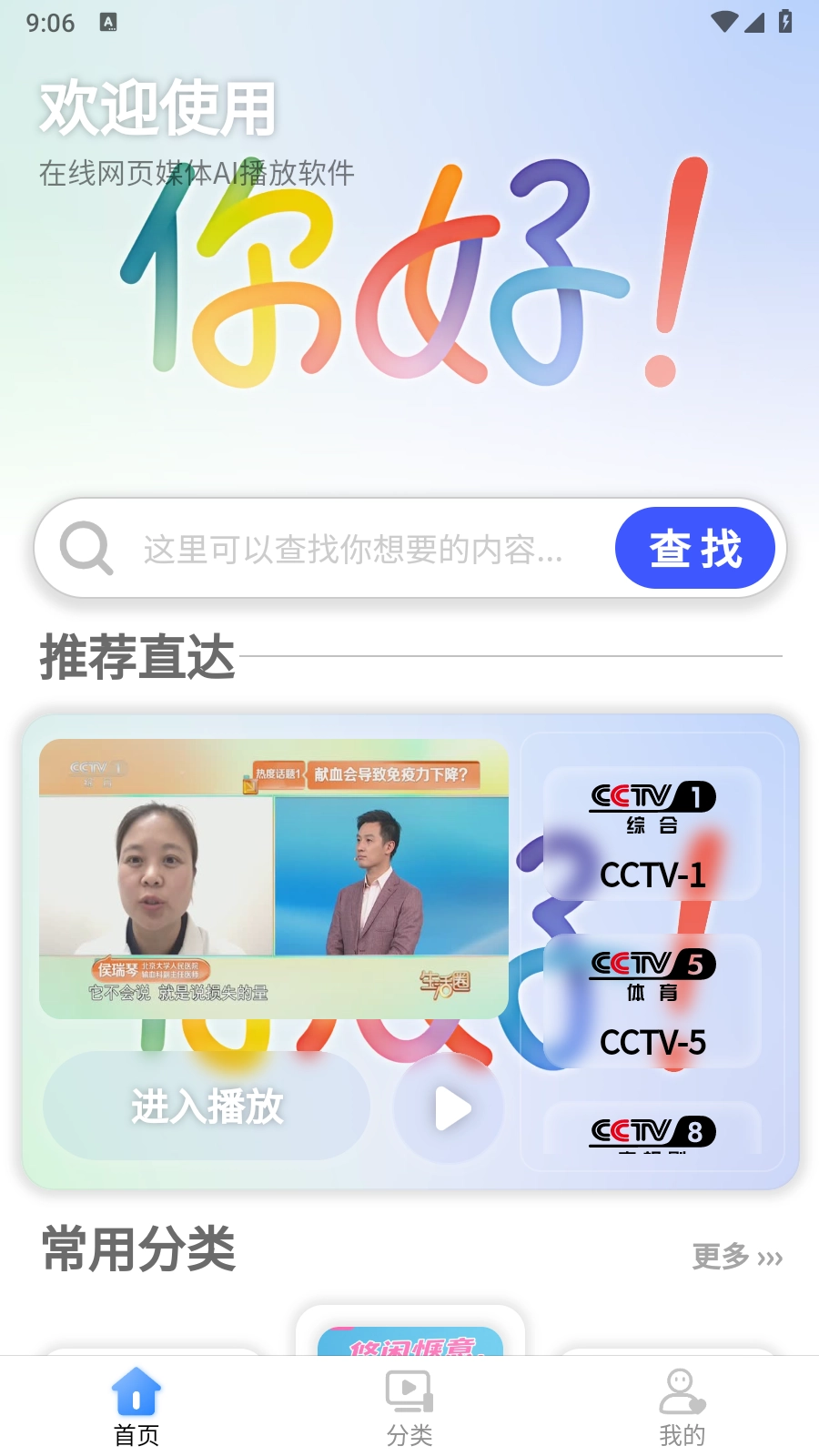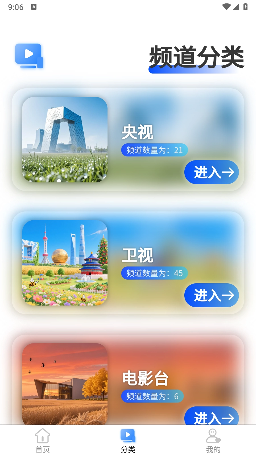 2.点击“分类”按钮,可以看到全面的电视频道分类,涵盖央视、卫视、电影台等