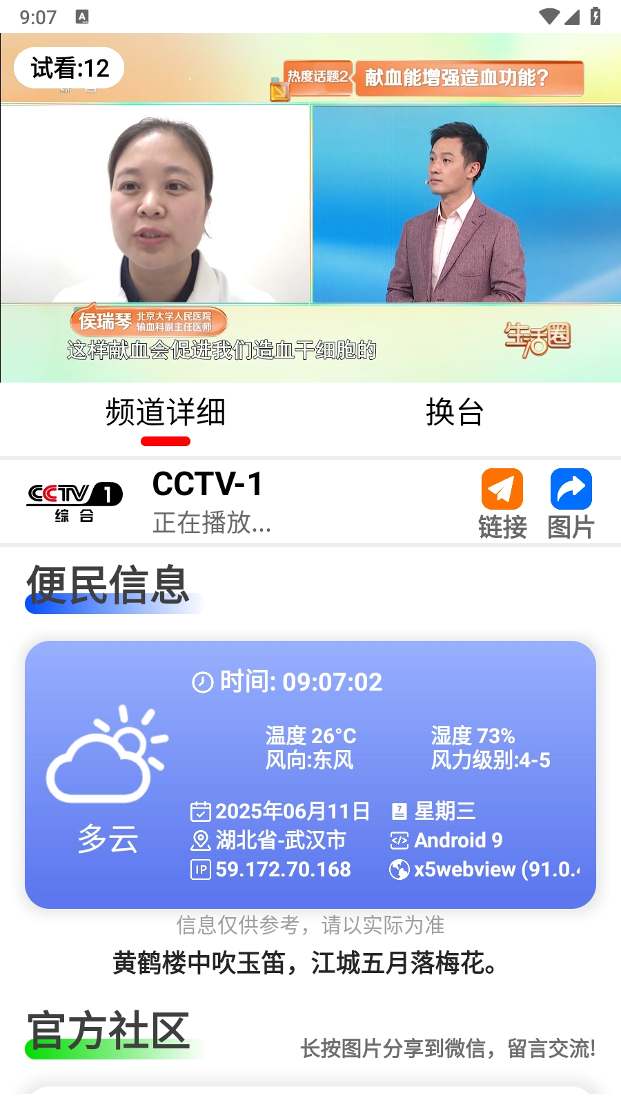 4.点击相关频道,就可以在线观看,下拉页面还能看到便民信息