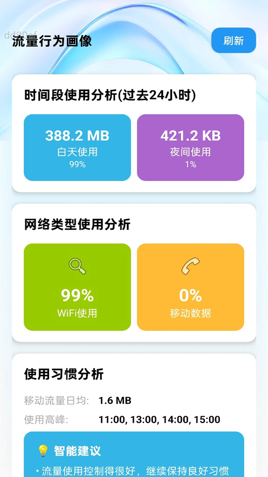 1. 拥有精准的流量行为画像能力,可细致划分过去24小时内白天及夜间的流量使用占比,以及WiFi和移动数据的使用比例。