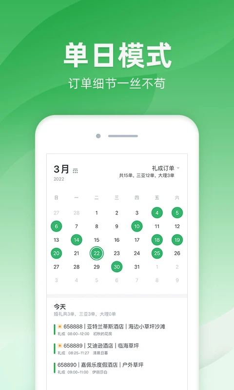 2、订单查询:可通过日历查询历史和当天订单,了解个人工作情况,并及时处理为完成订单;