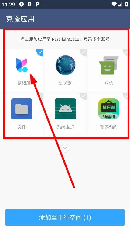1、在克隆应用中挑选想要添加的应用,例如一刻相册,点击后将其添加到Parallel Space。