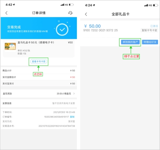 1、在盒马进入您购买的礼品卡订单详情页面,点击【查看卡号卡密】-【绑到我的账户】,根据提示就可以进行绑定啦!
