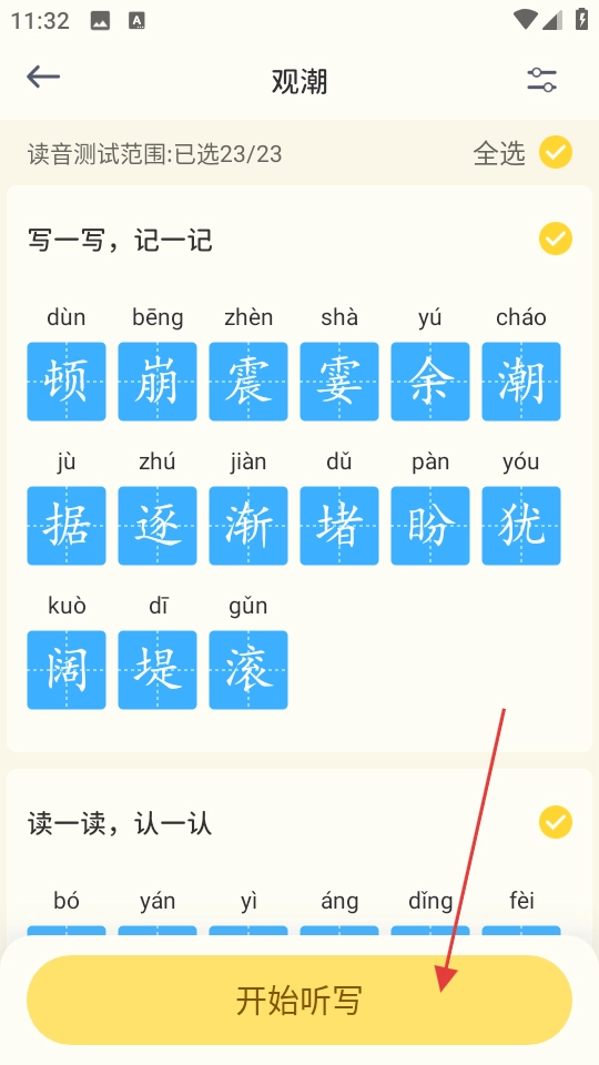 2、在观潮字词页选好测试范围,点击开始听写。