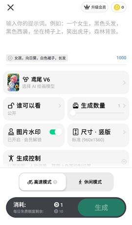 4、之后用户就需要打字描述出要绘画的人物形象,比如头发、脸型、嘴型、眼睛等等,输入完之后点击下方的生成就可以啦!