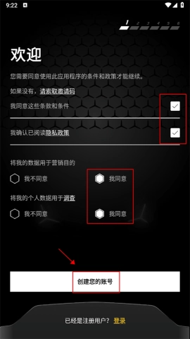 1. 打开应用之后,第一步要勾选全部条款以表明同意,接着点击创建账号。