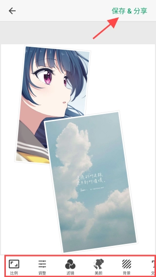 4、还可以添加滤镜、贴纸等,完成后保存或分享作品。