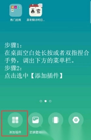 1.在手机桌面空白处长按开启编辑菜单栏,并点击“添加插件”功能。