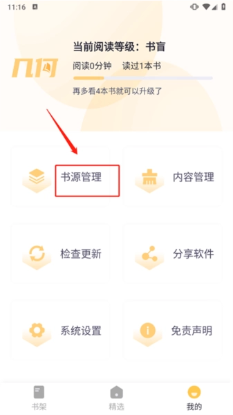 1、在本站安装几何阅读,在我的界面中点击书源管理功能;