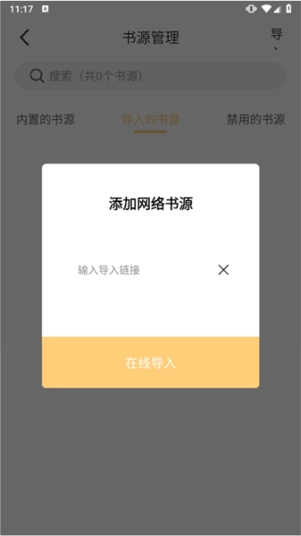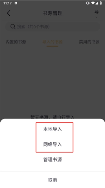4、例如网络导入,并将书源网址粘贴的框内点击在线导入即可。