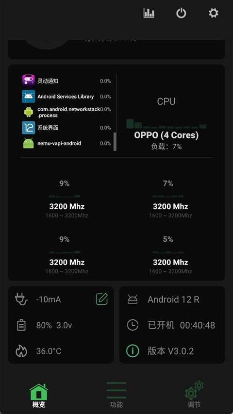 4、获取到设备的root权限后再次打开这个就会发现其和scene5的界面类似,例如对设备的内存、cpu、电量的使用运行情况都以图表的形式列举,让用户对手机设备的运行情况了如指掌