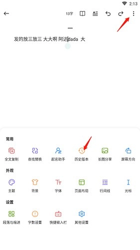 1、进入编辑页面,点击右上角的“更多”按钮,点击“历史版本”选项