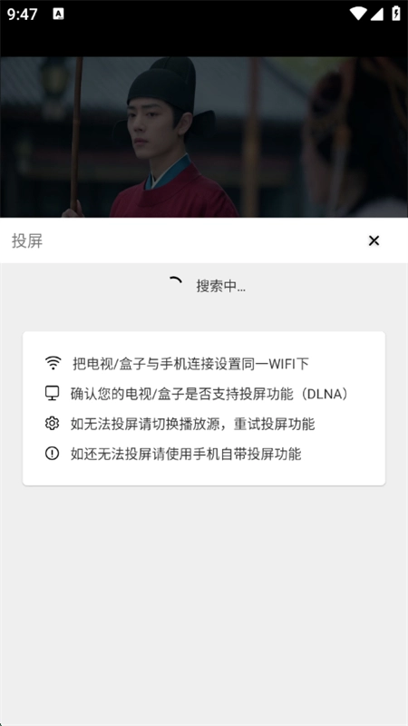 3、软件会快速搜索附近设备,需要把电视/盒子与手机连接设置同一WIFI下才能投屏哦