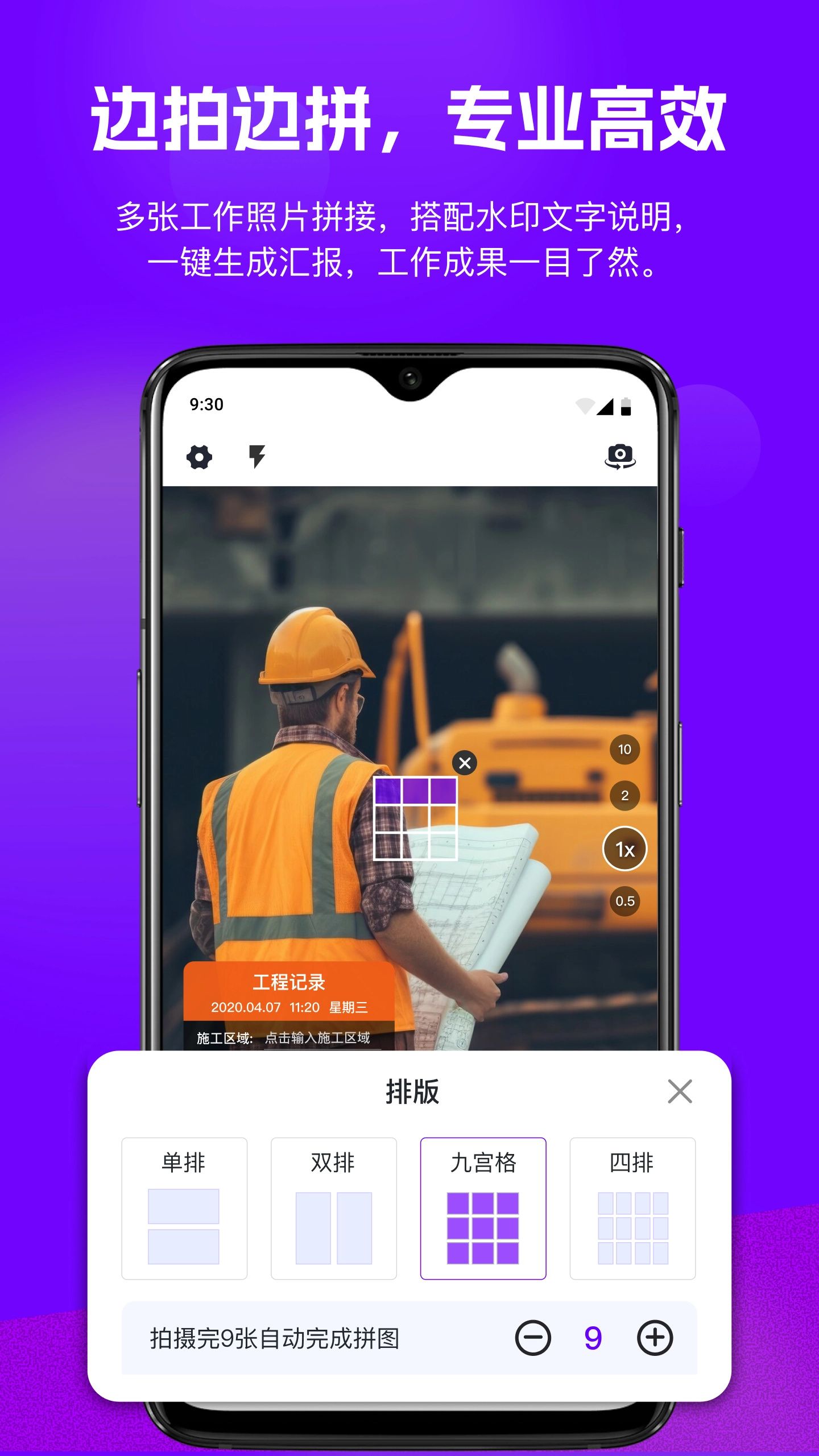 2、边拍边拼功能支持多张照片实时拼接,搭配自动水印和汇报模板,一键生成全景式汇报图片,大幅提升工作成果展示。