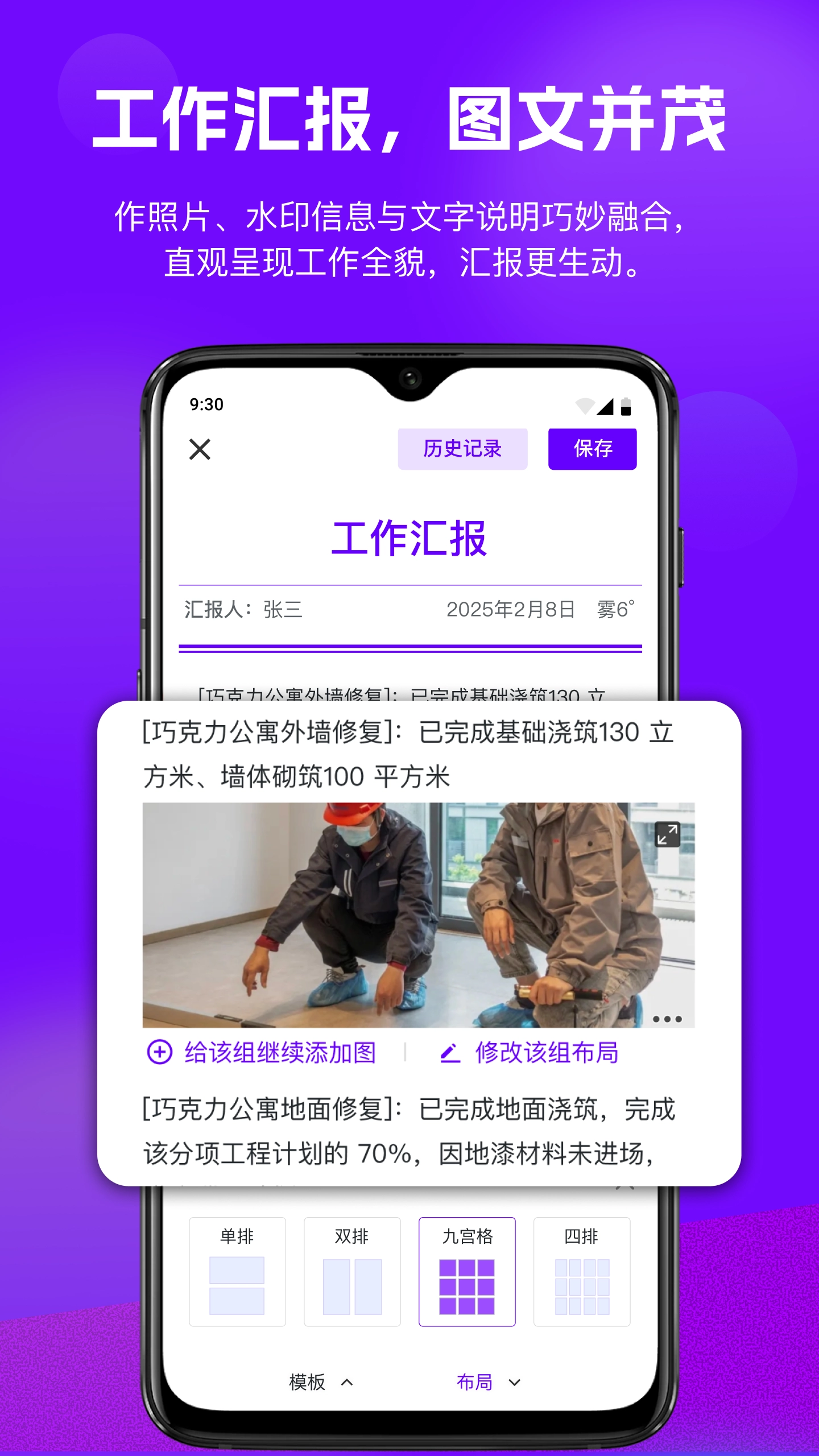 2、从水印添加到拼图排版、汇报生成全程流程简化,无需复杂设置,用户可快速完成工作记录与汇报,节省时间精力。