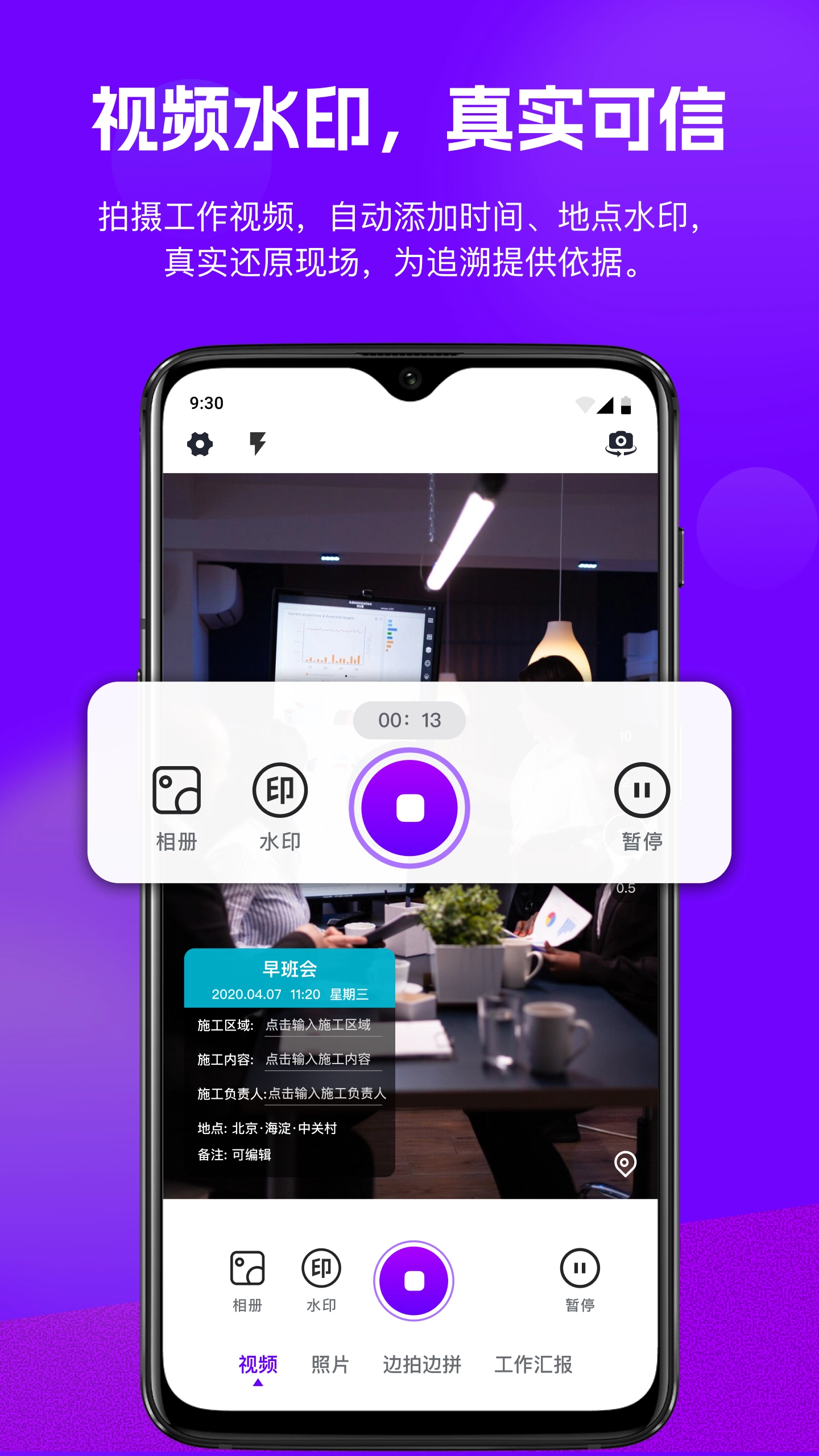 1、拍摄工作视频时自动添加时间、地点水印,真实还原现场情况,让视频成为可追溯的可靠资料,增强工作汇报说服力。