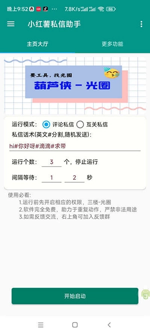 红薯私信助手是葫芦侠光圈大佬自制的小红书私信软件。该软件能够在评论中发布私信内容,还支持一键私信功能,只需开启相应权限即可。借助这个软件,既能实现互相关注从而涨粉丝,也能通过一键私信他人来获取客户。