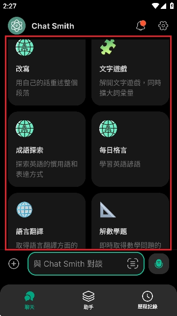 1、Chatsmith软件支持多种语言,在这里帮助用户可以更好的进行问题解答。