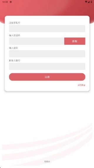 3、账号注册流程很简单,填写手机号、验证码,并且录入推荐人编码就行了。