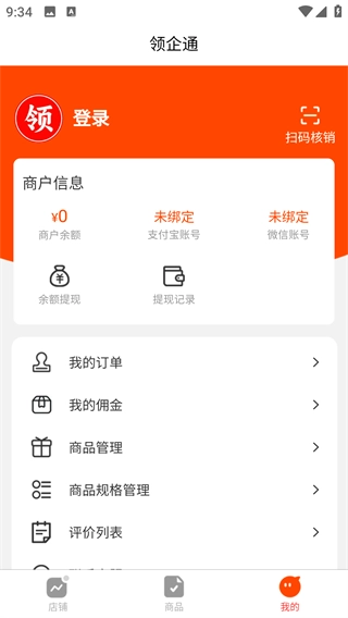 4、在我的个人中心,用户需先进行登录,登录完成后,即可绑定支付宝与微信账号,并且能够对自己的店铺开展运营管理工作。