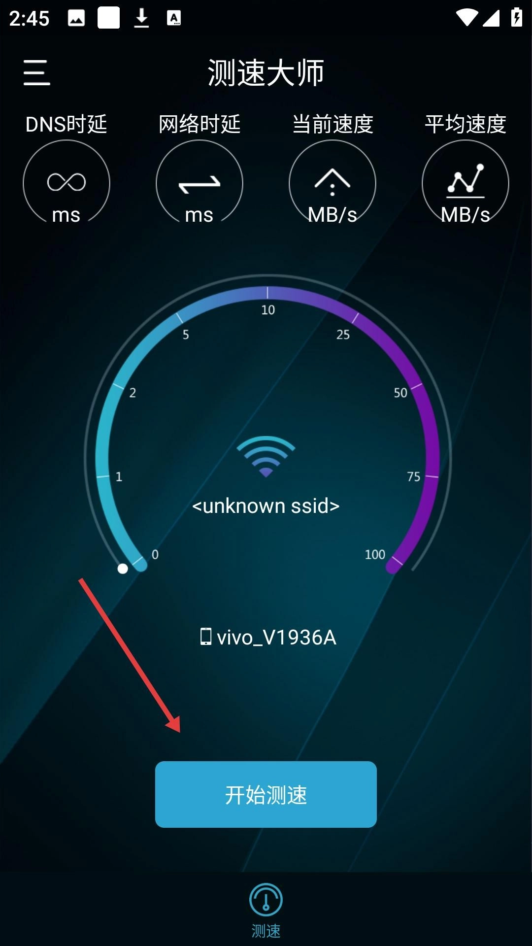 1. 启动测速大师,点击“开始测速”按钮,应用随即开始对网络性能进行检测,DNS时延、网络时延、当前速度等数据将实时呈现。