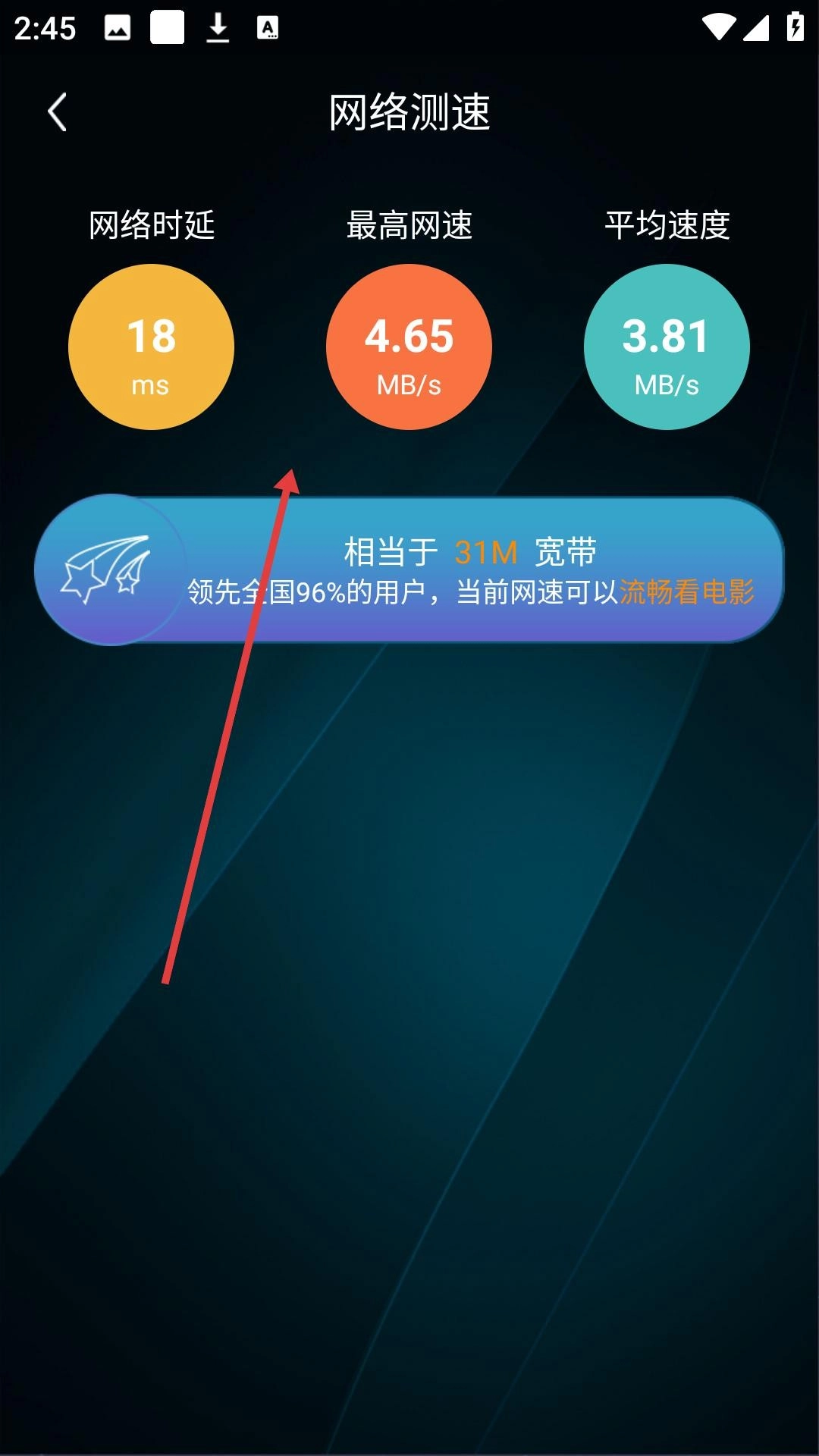 2、测速过程中应用会逐步展示各项网络数据,测速结束后,会呈现网络时延、最高网速、平均速度等详细结果,帮助用户了解网络状况。