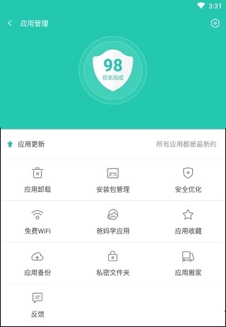 3、在管理中心的右侧则是应用管理,在这里无论是应用卸载、安装包管理,还是安全优化,免费WiFi的获取,它都有提供。另外应用收藏、搬家、备份,以及私密文件夹的设定全都通过这里可以设置。