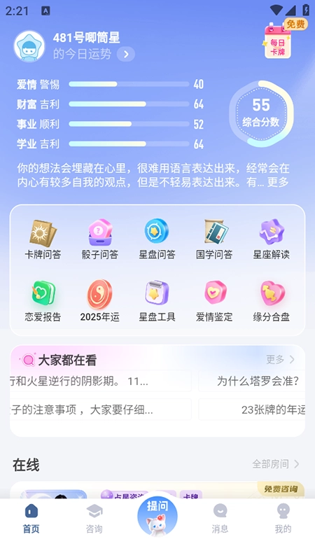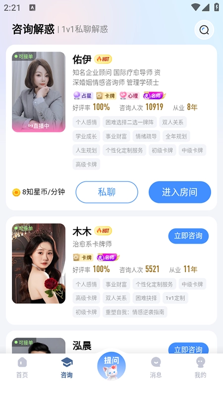 3、情感咨询:专业认证咨询师24小时提供服务,涵盖情感、事业、财富、求学等多个项目,支持语音房在线连麦咨询,效率更高、更及时,还有名师咨询团答疑解惑。