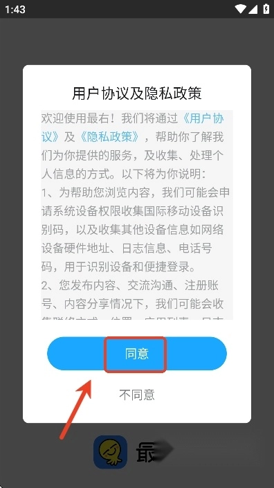 开启时,用户需先点击“同意”,以同意软件协议政策。