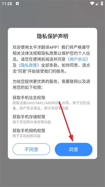 1. 第一步,打开太平洋翻译,仔细阅读“隐私保护声明”后予以同意。