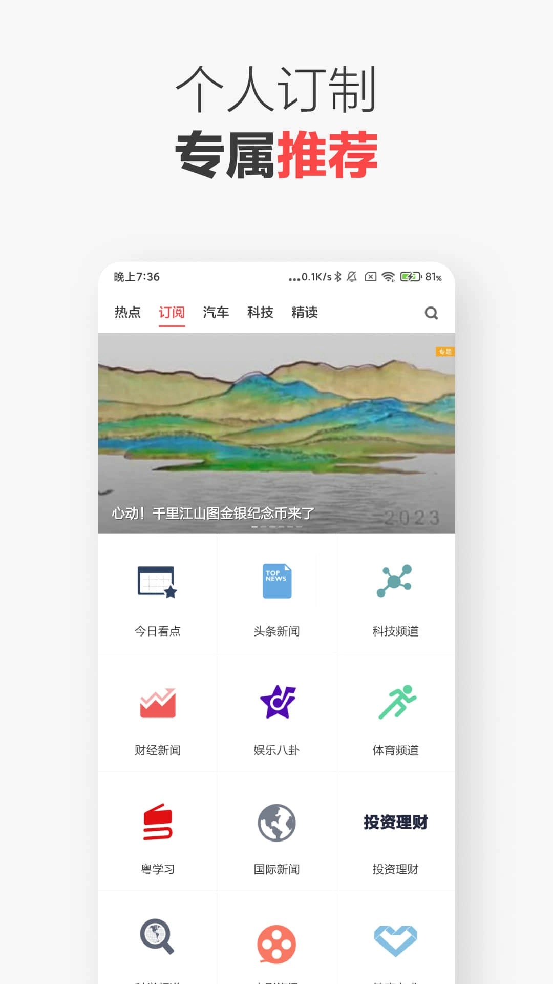 新闻、财经、科技、体育、汽车、时尚、娱乐、游戏动漫、星座、旅游、美食、美图等近20大频道,千种精品内容源,实时更新,自由添加。
