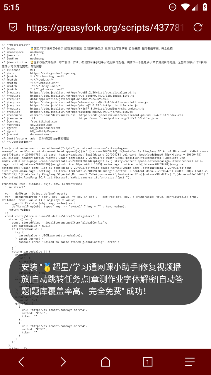6、脚本就安装成功了,过程并不复杂,电脑端的脚本安装也是这个步骤。