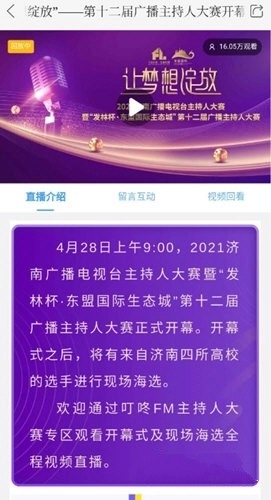 3、在视频下方有直播介绍、留言互动、视频回放功能,点击播放页面还可以选择全屏功能。