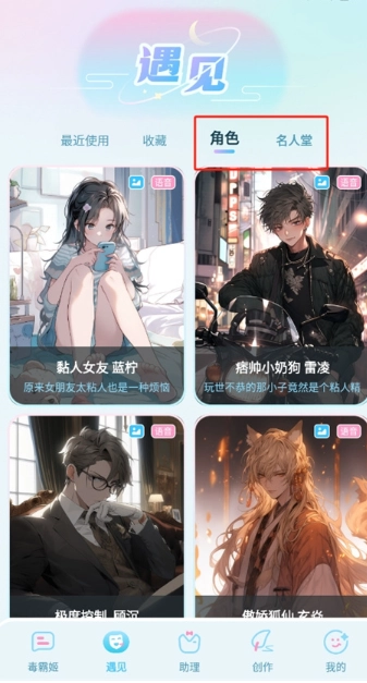 2、点击角色或者名人堂即可选择AI角色来进行聊天