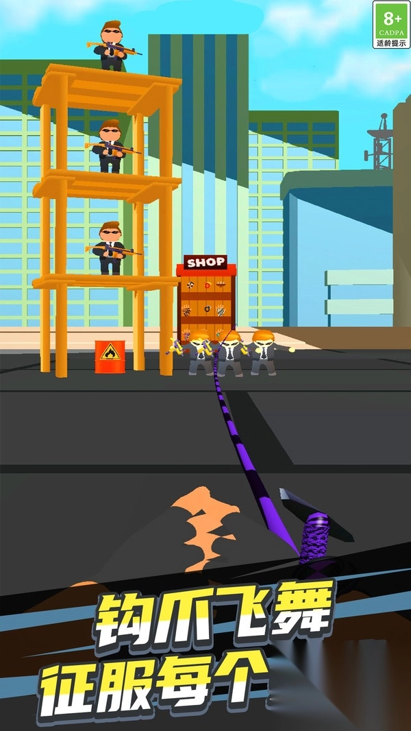 1. 通过滑动屏幕来瞄准敌人,随后点击发射钩爪,若成功命中敌人即可将其击败,操作时要留意角度与距离。