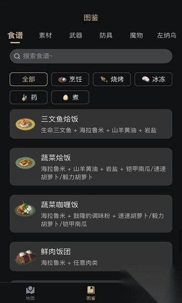 4、若想查看游戏的食谱、武器、素材、防具、魔物等详细信息,可以点击底部的【图鉴】选项。