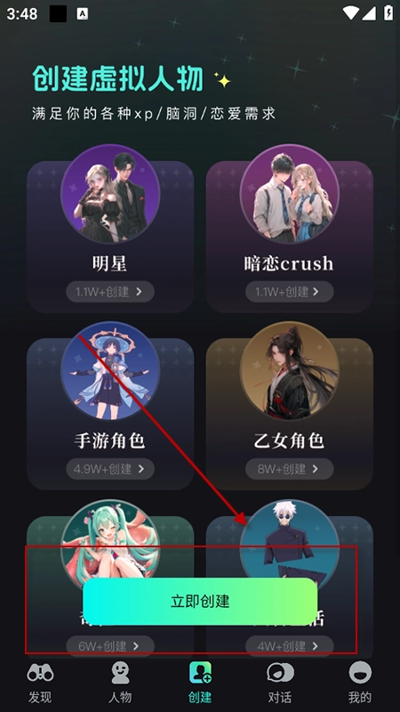 3、若想拥有专属AI,点击创建智能体入口,按照引导设置性格、世界观、语气风格等标签,完成后即可与新创建的AI互动。