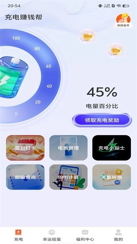 充电赚钱帮,是一款融合了充电、幸运扭蛋以及福利中心功能的软件。它能实时监控并管理用户手机电量,让用户随时清晰知晓手机剩余电量,以便及时充电。在这里,用户不仅能轻松领取充电奖励,获得专属充电福利,积累的金币还能随时变现,获取现金收益。用户还可参与幸运扭蛋活动,有机会赢得幸运大奖。软件推出众多奖励任务,完成各项任务就能轻松拿到任务奖励。另外,软件内还提供充电小贴士、签到打卡、邮编查询、BMI计算、简繁转换等多种实用工具,满足用户日常所需。有需要的用户,快来充电赚钱帮体验吧!