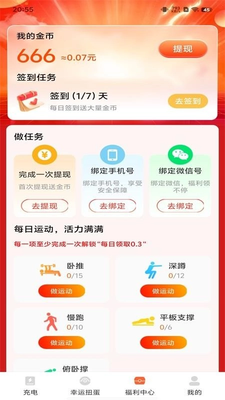 5、进入到福利页面中可以查看到各种各样的福利任务,完成任务可获取金币奖励;